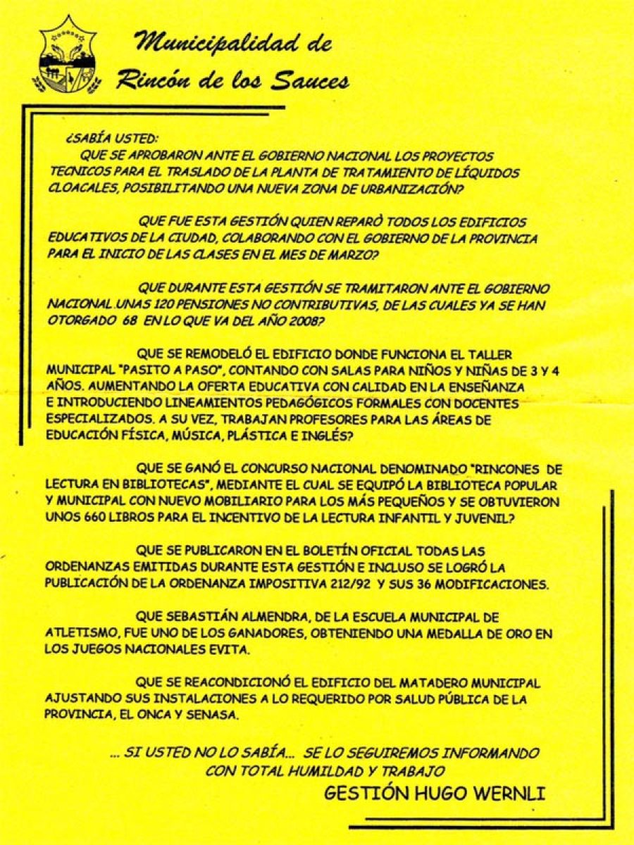 Entre otros varios textos más que hablan del polideportivo, como se están preparando terrenos para su entrega o como se sembraron plantines de frutas finas en el vivero de la escuela 238, finaliza diciendo “... Si usted no lo sabía... Se lo seguiremos informando. Con total humildad y trabajo. Gestión hugo wernli”