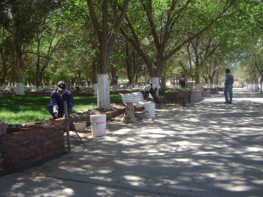 Operarios de la Cooperativa 14 de Septiembre, al servicio de la Municipalidad de Rincón de los Sauces, realizan un reacomodamiento general de la Plaza General San Martín.