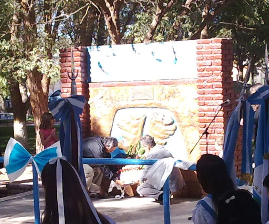 La ceremonia comenzó con la colocación por parte del ex combatiente Marcos Zúñiga y el intendente Hugo Wernli de una ofrenda floral en el monumento a las Malvinas, para dar luego espacio al discurso del intendente.