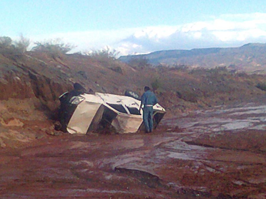 Otros no aceptaron lo que la naturaleza le propuso, y decidieron cruzar con su camioneta un cañadon en uno de los yacimientos, terminando su vehículo totalmente destrozado, pudiendo escapar y salir ilesos antes de que la corriente los arrastrara.
