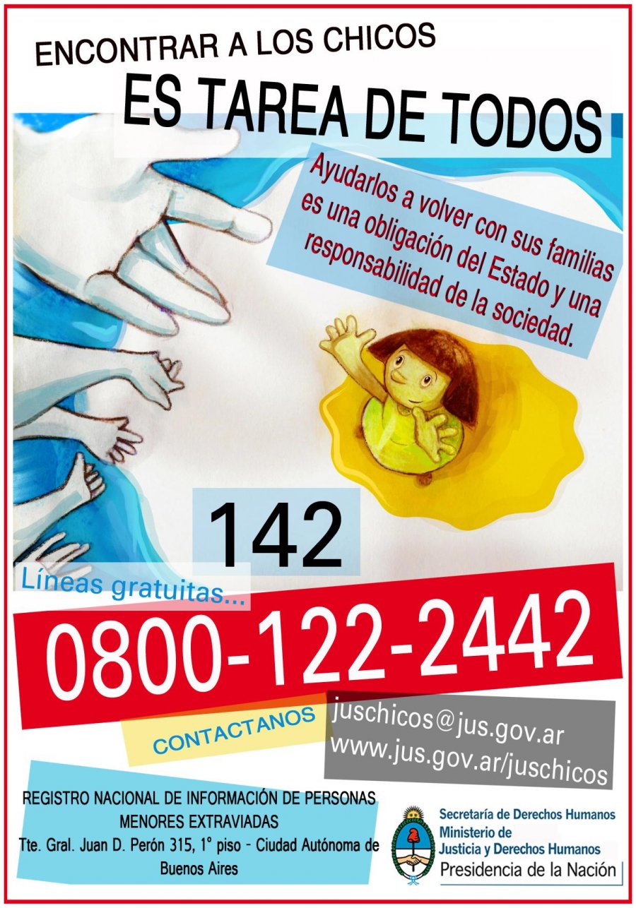 El Registro Nacional de Información de Personas Menores Extraviadas cuenta con las líneas telefónicas gratuitas 142 y 0800-122-2442, y puede ser contactado también por correo electrónico a [email protected].