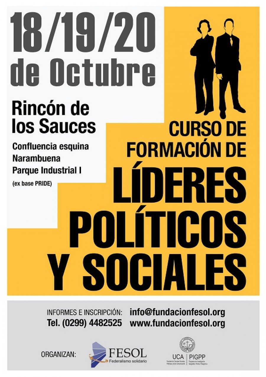 Desde el próximo jueves 18 de octubre, la Fundación Fesol y la UCA dictarán un curso de formación de Líderes Políticos y Sociales en un salón brindado por la municipalidad en la ex base Pride, cuyo fin busca contribuir en la preparación de todos aquellos que tengan inquietudes políticas, sociales y emprendedoras, estén o no participando en alguna actividad.