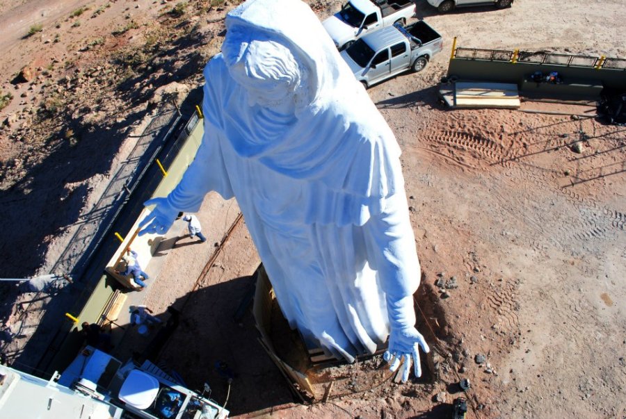 El pasado sábado 2 de febrero, el escultor Aldo Beroisa, realizó los trabajos de pintura sobre la enorme escultura finalizando de esta manera su tarea en la obra mencionada. Mediante una grúa de importantes dimensiones y con el soporte de una jaula metálica, el escultor pudo finalizar la pintura blanca agregando microfibras que dan brilllo y movimiento a la estatua.