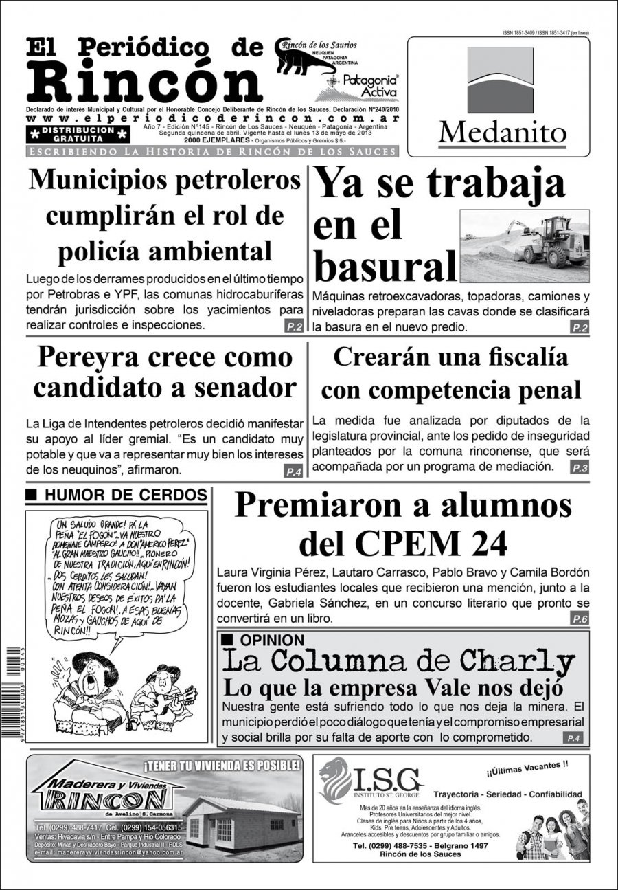 Cabe destacar que la versión en papel, que se confecciona cada 15 días, permite a los lectores acceder a un resumen de noticias único y exclusivo de la localidad de Rincón de los Sauces, así como notas producidas para este medio excepcionalmente, y que cuando algunos decían “no lo compro por que leo la web”, podrán apreciar lo que se estaban perdiendo.