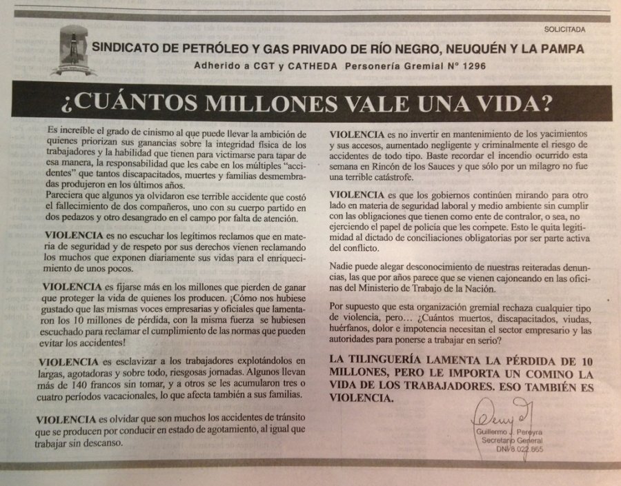 “VIOLENCIA es fijarse más en los millones que pierden de ganar que proteger la vida de quienes los producen. ¡Cómo nos hubiese gustado que las mismas voces empresarios y oficiales que lamentaron los 10 millones de perdida, con la misma fuerza se hubiesen escuchado para reclamar el cumplimiento de las normas que pueden evitar los accidentes!”