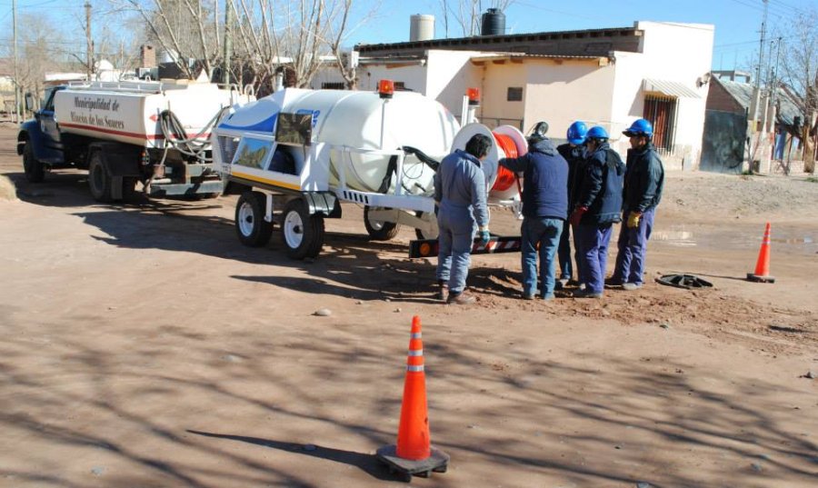 Operarios de Servicios Públicos realizaron trabajos de limpieza de sobre una tubería cloacal ubicada en calle Chaco y Buenos Aires utilizando el recientemente adquirido equipo desobstructor clocal.