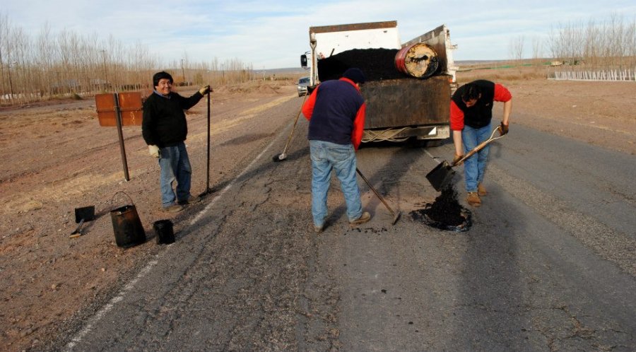 Trabajadores de la Dirección Provincial de Vialidad realizan las tareas de bacheos en las rutas 5 y 6 donde el peso de los vehículos ha dejado enormes pozos y surcos provocando un serio deterioro sobre la cinta asfáltica.
