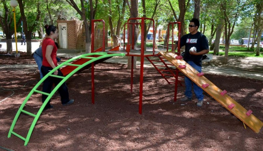 Integrantes de la Dirección Juventud Municipal, la agrupación Jóvenes en Movimiento, ligada al partido provincial, junto a chicos autodenominados skaters y bakers realizaron las instalaciones y acomodamiento de los juegos donados por la empresa Jhonatan S.A.