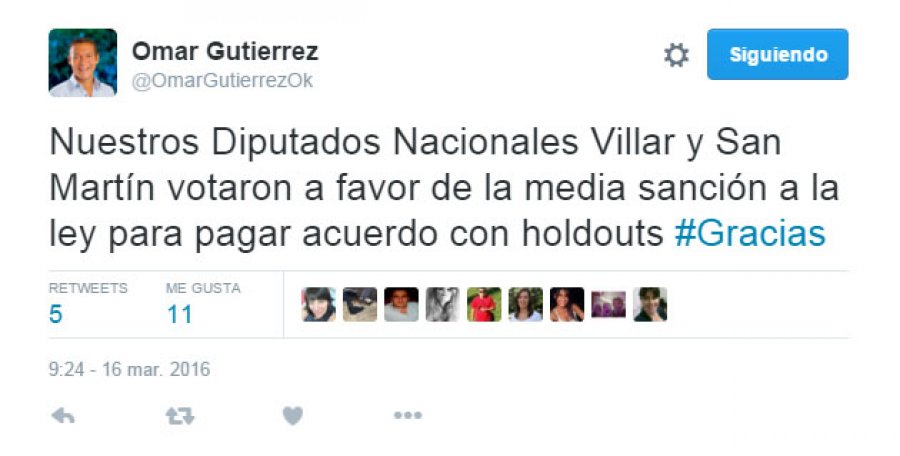 “Nuestros Diputados Nacionales Villar y San Martín votaron a favor de la media sanción a la ley para pagar acuerdo con holdouts #Gracias”, escribió el mandatario neuquino.
