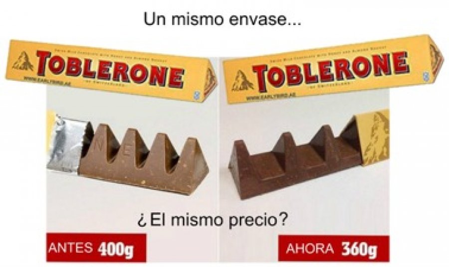 Estos fenómenos se registran en diferentes productos, desde las golosinas, pasando por los lácteos, hasta las galletitas. En ese sentido, el trabajo señaló que “un clásico ejemplo es el del reconocido chocolate Toblerone (de Mondelez) que en su aspecto exterior mantuvo el largo del envase tradicional, pero redujo el gramaje, que es notable al abrirlo en la cantidad de sus triángulos.