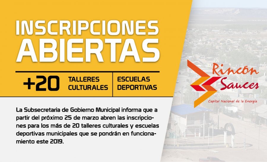 La Subsecretaria de Gobierno Municipal informó que a partir del próximo 25 de marzo abren las inscripciones para los más de 20 talleres culturales y escuelas deportivas municipales que se pondrán en funcionamiento este 2019.