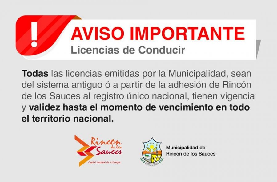 El Departamento de Policía Municipal informó que todas las licencias emitidas por la Municipalidad, sean del sistema antiguo o a partir de la adhesión de Rincón de los Sauces al registro único nacional, tienen vigencia y validez hasta el momento de vencimiento en todo el territorio nacional.