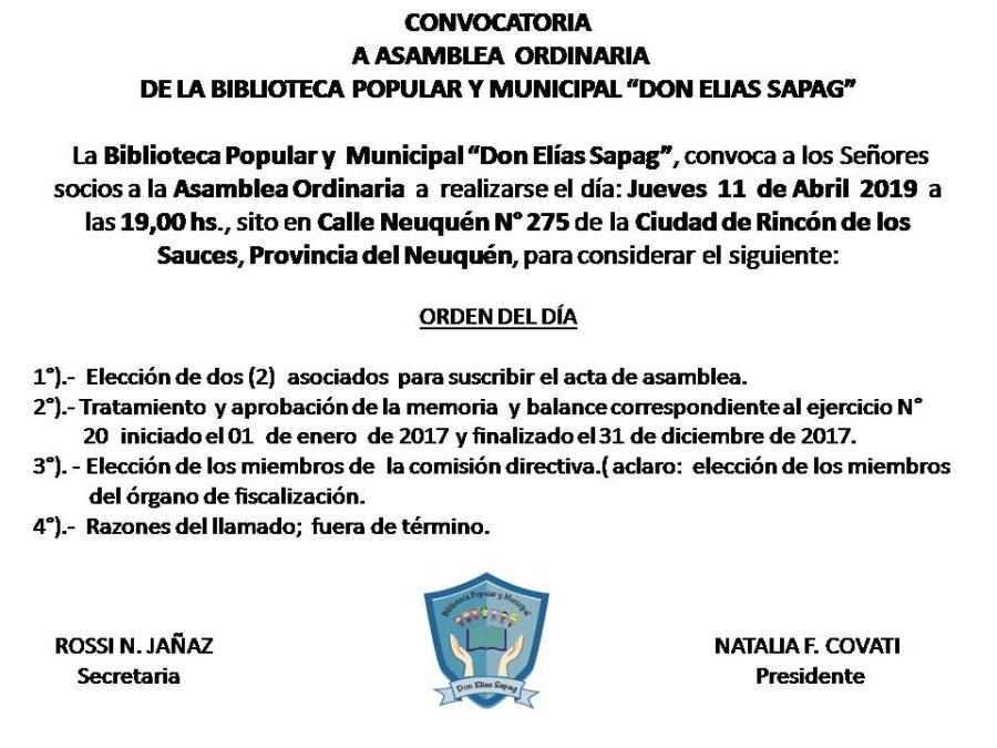 En una convocatoria firmada por la secretaria Rossi Jañaz y la presidenta Natalia Covati, desde la Biblioteca Popular y Municipal Don Elías Sapag, se convocó a los asociados a la Asamblea Ordinaria a realizarse el jueves 11 de Abril 2019 a las 19,00 horas.