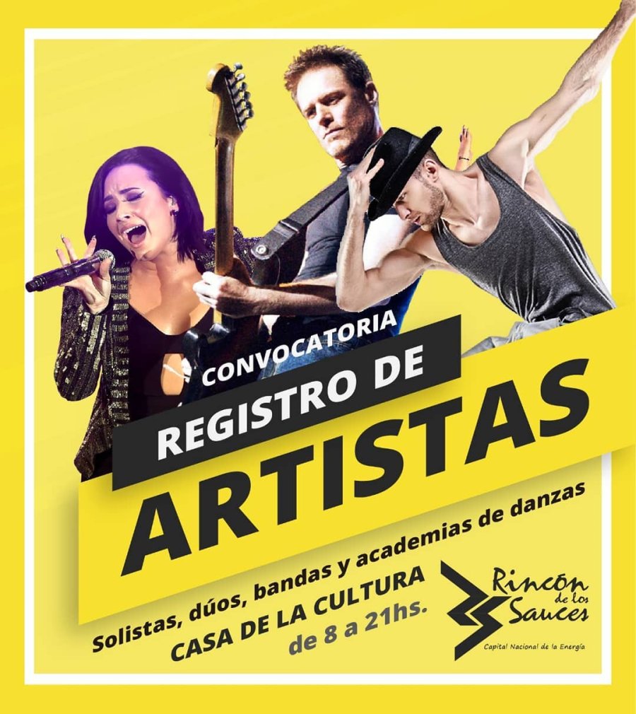 La Dirección de Cultura Municipal convoca a los artistas solistas, dúos, bandas y academias de danzas de Rincón de los Sauces a acercarse hasta Casa de la Cultura para actualizar el registro de Artistas 2019.