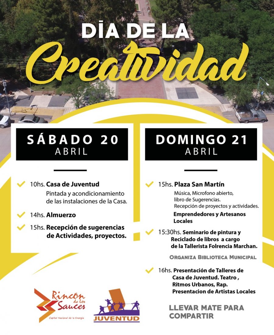 La Dirección de Juventud invita a toda la comunidad el próximo sábado 20 y domingo 21 de abril a las actividades por Día de la Creatividad.