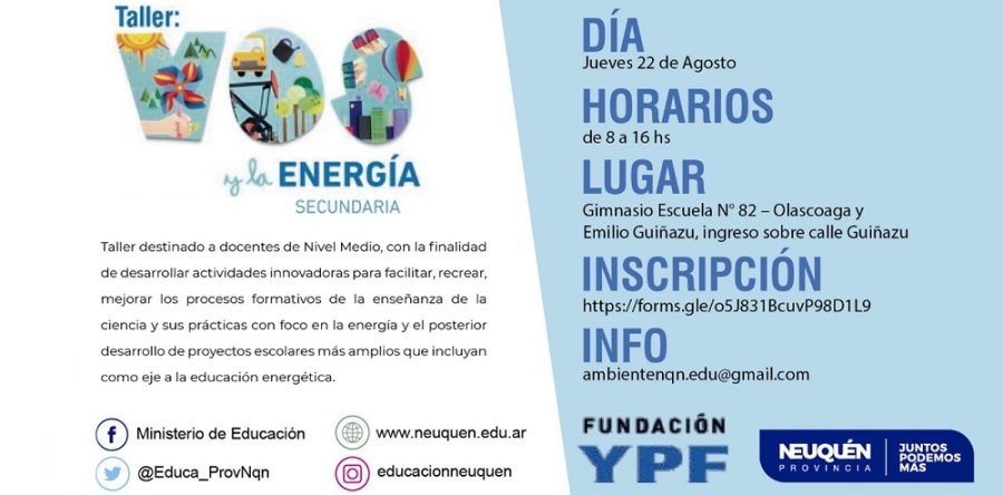 El jueves 22 de agosto se realizará el taller gratuito de formación docente “Vos y la energía”, organizado a partir de la articulación entre el ministerio de Educación de la provincia y la Fundación YPF.