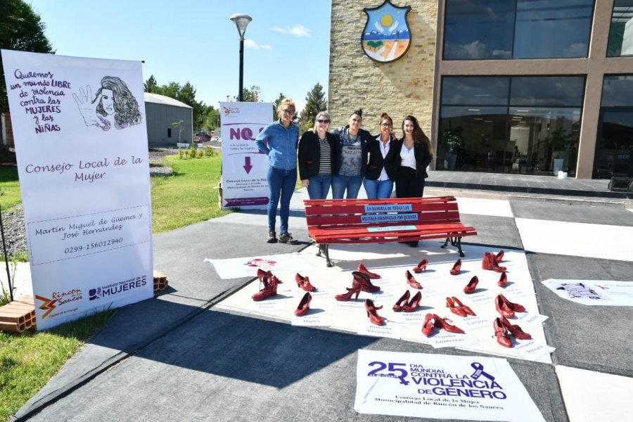 Personal de la comuna realizaron una intervención con la colocación de zapatos rojos, que recuerda a las mujeres víctimas de la violencia en el mundo entero.