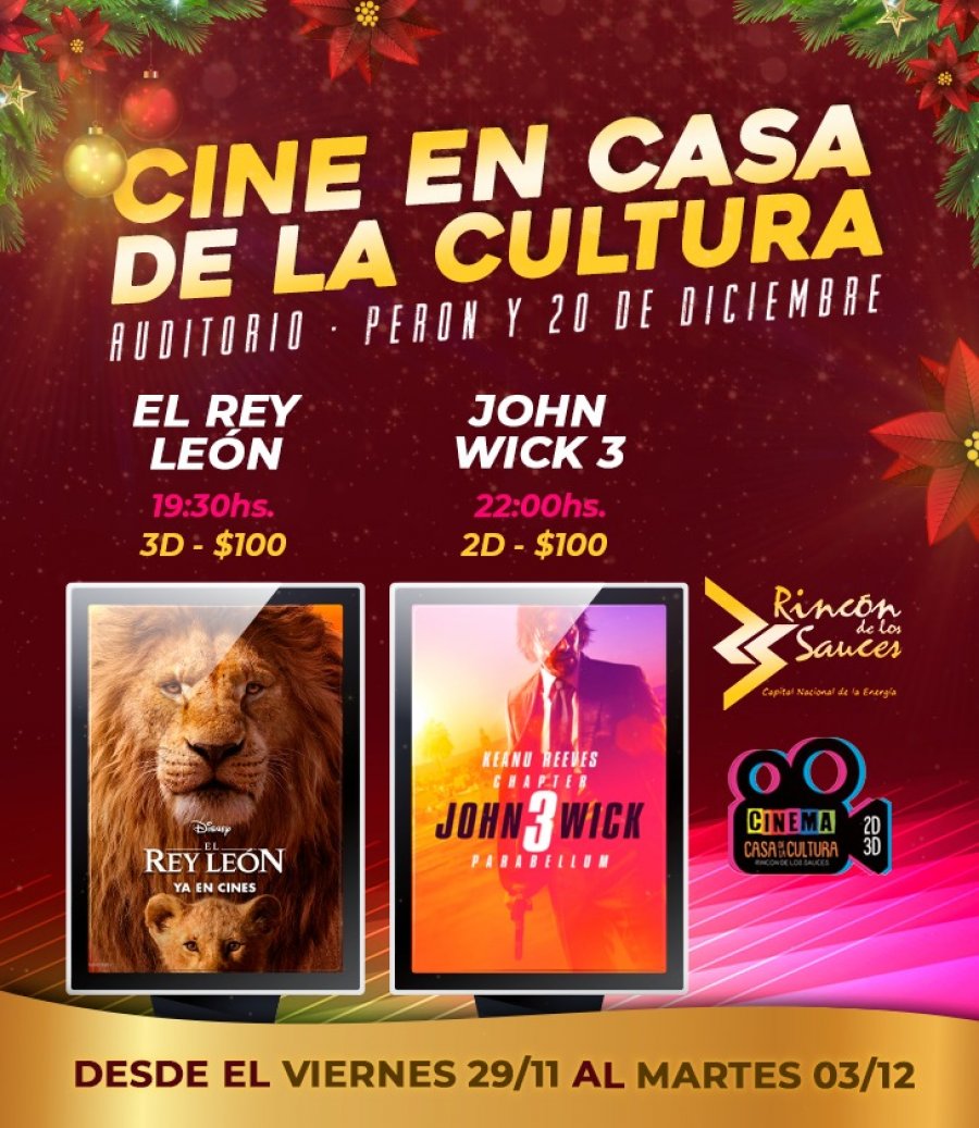 La municipalidad de Rincón de los Sauces informó sobre las películas que se proyectarán entre fines de noviembre y comienzos de diciembre, a precios promocionales.