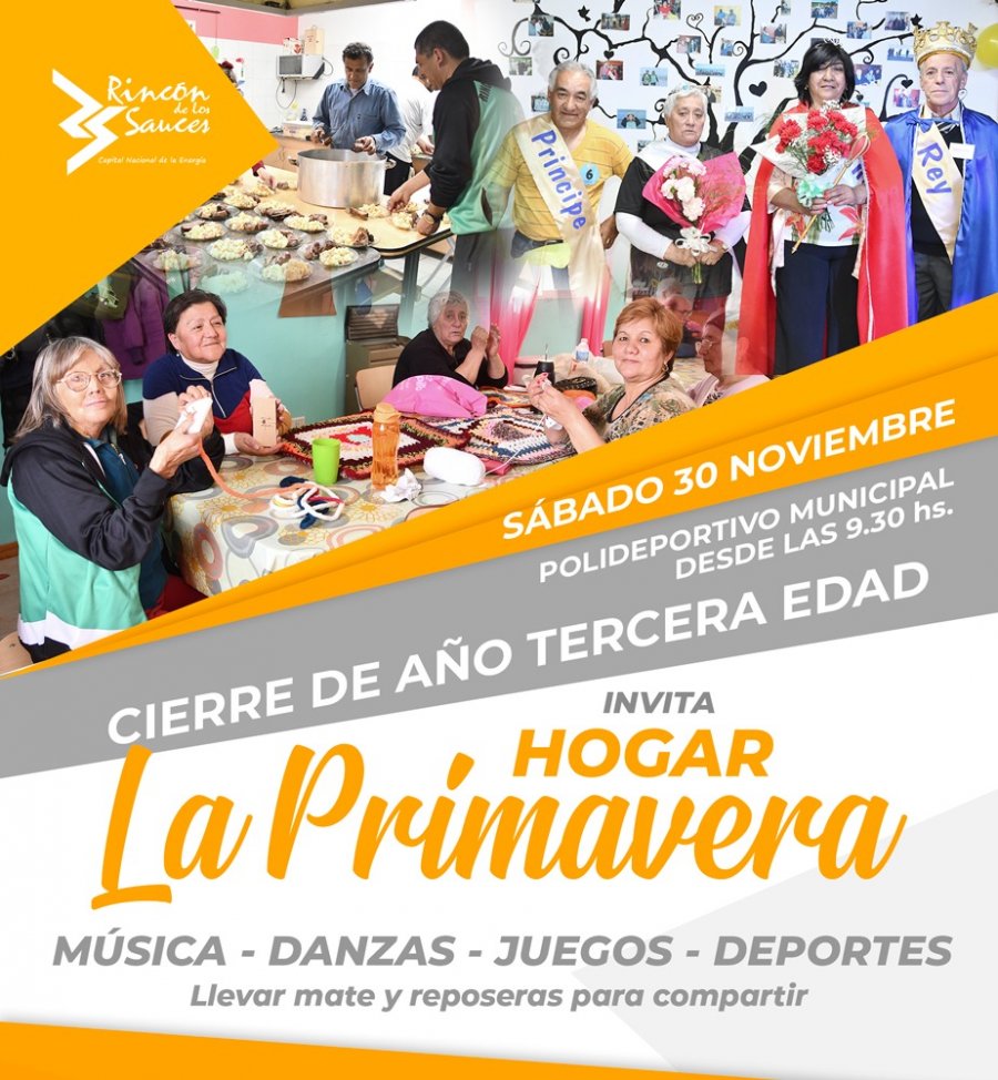 El Hogar Primavera, invita al cierre del ciclo 2019 de la Tercera Edad a realizarse en el Polideportivo Municipal, el día sábado 30 de noviembre a partir de las 9.30 horas.