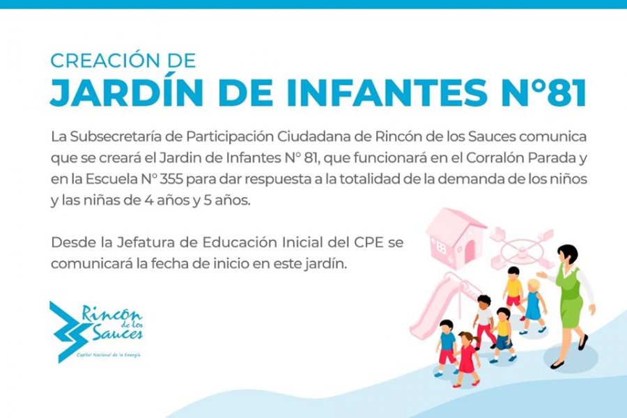 “La Subsecretaría de Participación Ciudadana dependiente de la Municipalidad de Rincón de los Sauces informó respecto a la creación del Jardín de Infante Nº 81 que dicha institución funcionará en instalaciones de Corralón Parada y en Escuela Primaria Nº 355 dando respuesta a la totalidad de la demanda de niños y niñas de 4 y 5 años”, se informó en un comunicado.