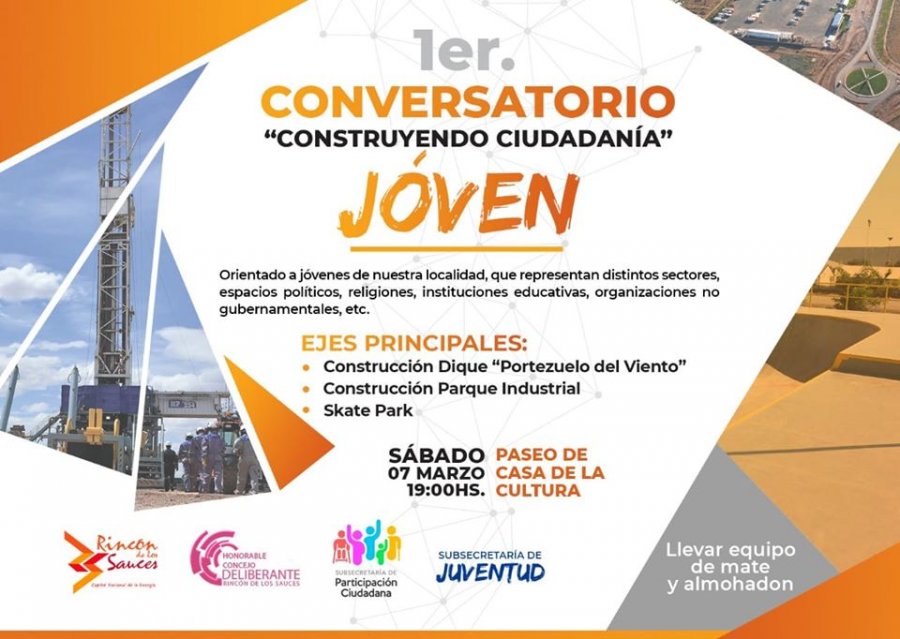 El próximo sábado 7 de marzo, a partir de las 19 horas se llevará a cabo el "1° conversatorio, "Construyendo Ciudadanía\'" en el paseo de Casa de la Cultura de Rincón de los sauces.
