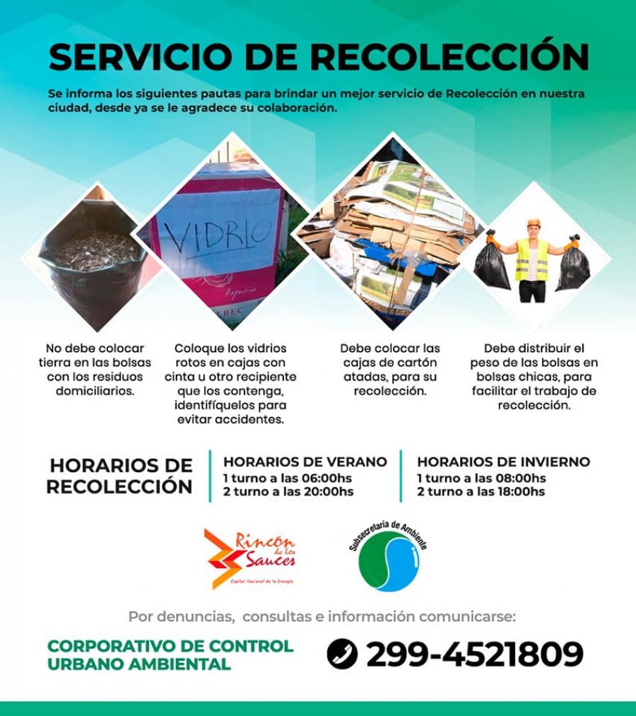 La Subsecretaría de Ambiente de Rincón de los Sauces informa, que presentan anomalías en la recolección de residuos pero pronto el servicio será normalizado.