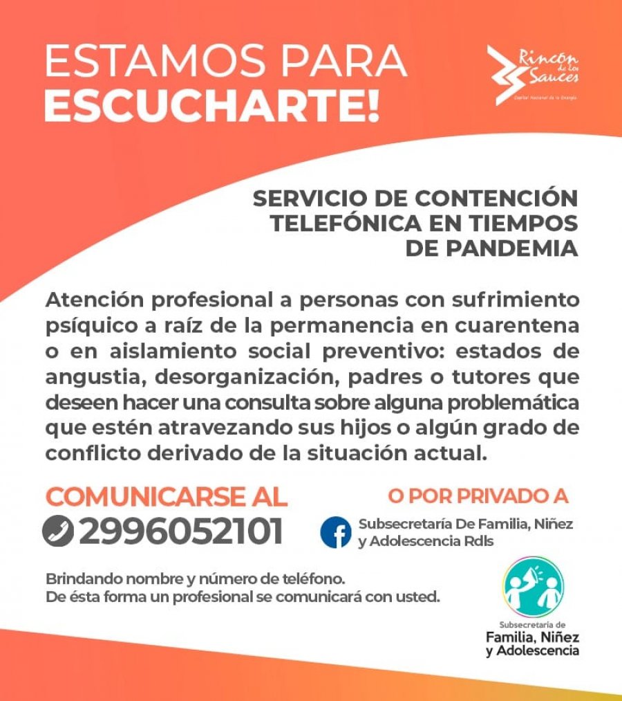 La línea telefónica disponible es 2996052101 o a la fan Page de Facebook, "Subsecretaría de familia, Niñez y Adolecencia RdlS" donde dejando datos y contacto, el personal se comunicará lo antes posible.