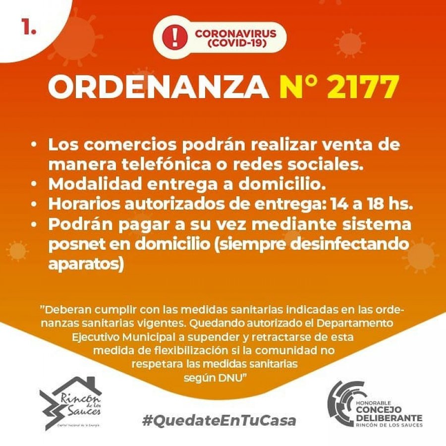 En su artículo 1, la norma dispone una normativa comercial de emergencia que a continuación se detalla, que tendrá vigencia mientras dure el aislamiento social, preventivo y obligatorio dispuesto por el Gobierno Nacional o decisión en contrario de éste Concejo Deliberante, de acuerdo con el avance de la pandemia en nuestro País y sujeto -además- al estricto cumplimiento de los vecinos de la ciudad.