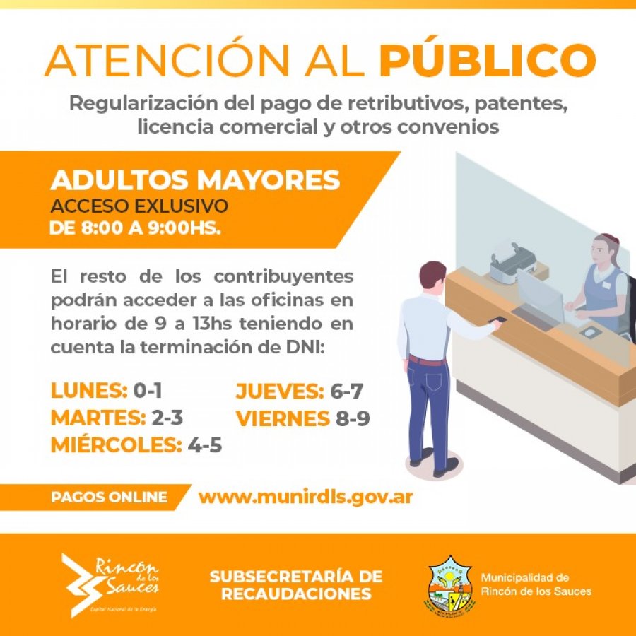 En tanto que el resto de los contribuyentes podrán acceder a las oficinas en horario de 9 a 13hs teniendo en cuenta la terminación de DNI: lunes 0-1, martes 2-3, miércoles 4-5, jueves 6-7, viernes 8-9.