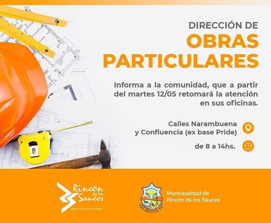 La municipalidad de Rincón de los Sauces informó que la Dirección de Obras Particulares retomó desde este martes 12 de mayo la atención en sus oficinas de Calles Narambuena y Confluencia (ex base Pride), en horario de 08:00 a 14 horas.
