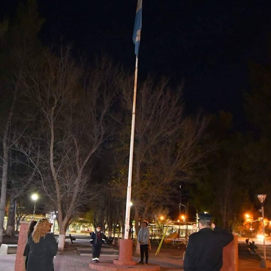 En el marco del bicentenario del fallecimiento del general Manuel Belgrano y en el contexto de la pandemia del COVID-19, que impide las reuniones de personas, funcionarios municipales y autoridades policiales, izaron en la noche del 20 de junio la bandera en la Plaza San Martín.