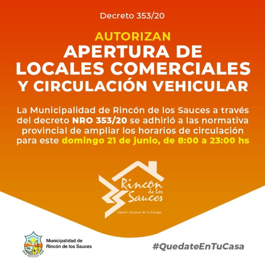 La Municipalidad de Rincón de los Sauces, a través del Decreto NRO 353/20, se adhirió a las Normativa Provincial de ampliar los horarios de circulación para este domingo 21 de junio de 8 a 23 horas, como así también se autorizó, de modo excepcional, la circulación vehicular y la apertura de locales comerciales.