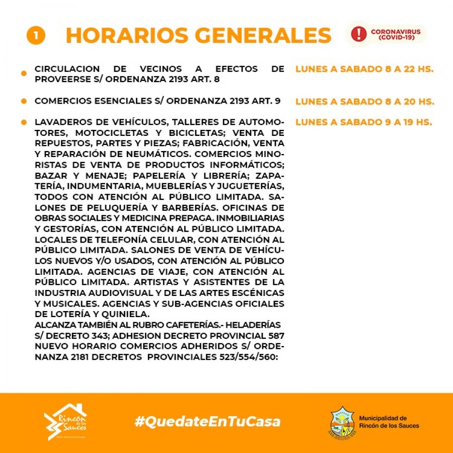 Para el resto de la actividad comercial, el horario es de 9 a 19 horas, de lunes a sábado e incluye: Lavaderos De Vehículos, Talleres De Automotores, Motocicletas Y Bicicletas; Venta De Repuestos, Partes Y Piezas; Fabricación, Venta Y Reparación De Neumáticos. Comercios Minoristas De Venta De Productos Informáticos; Bazar Y Menaje.