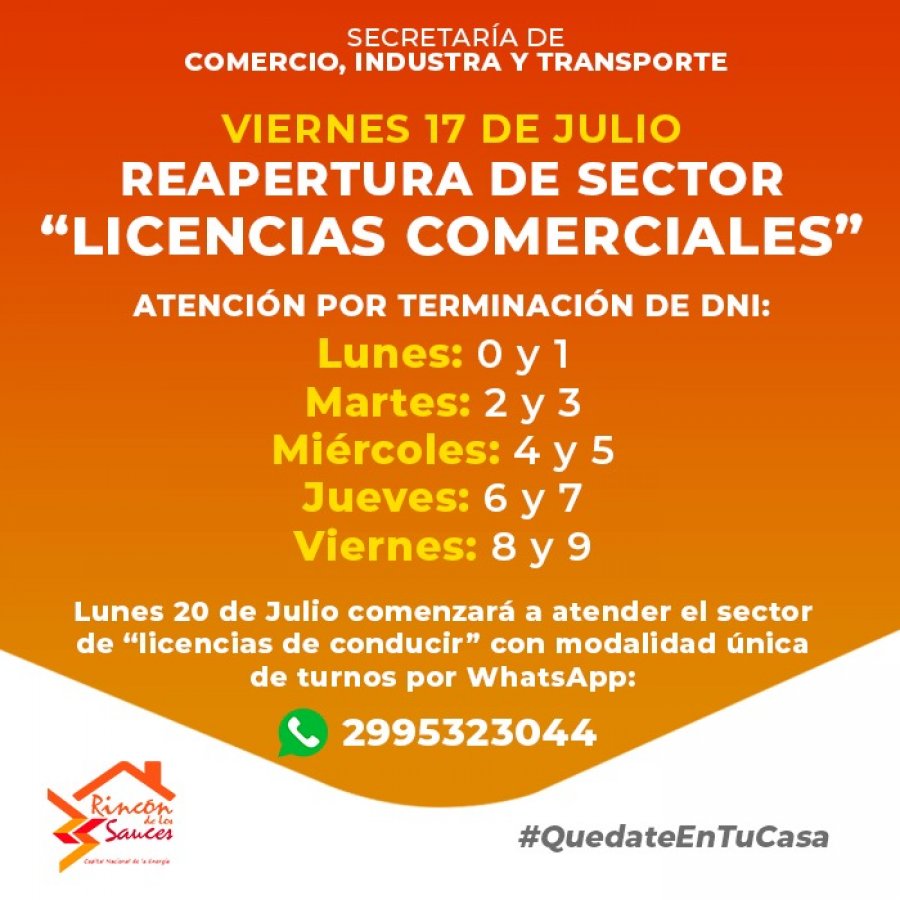 Además el Secretario del área, Javier Romero, informó que desde el próximo lunes 20 de Julio comenzará a atender el sector de “Licencias de Conducir”, atendiendo con modalidad única de turnos por WhatsApp al 2995323044.