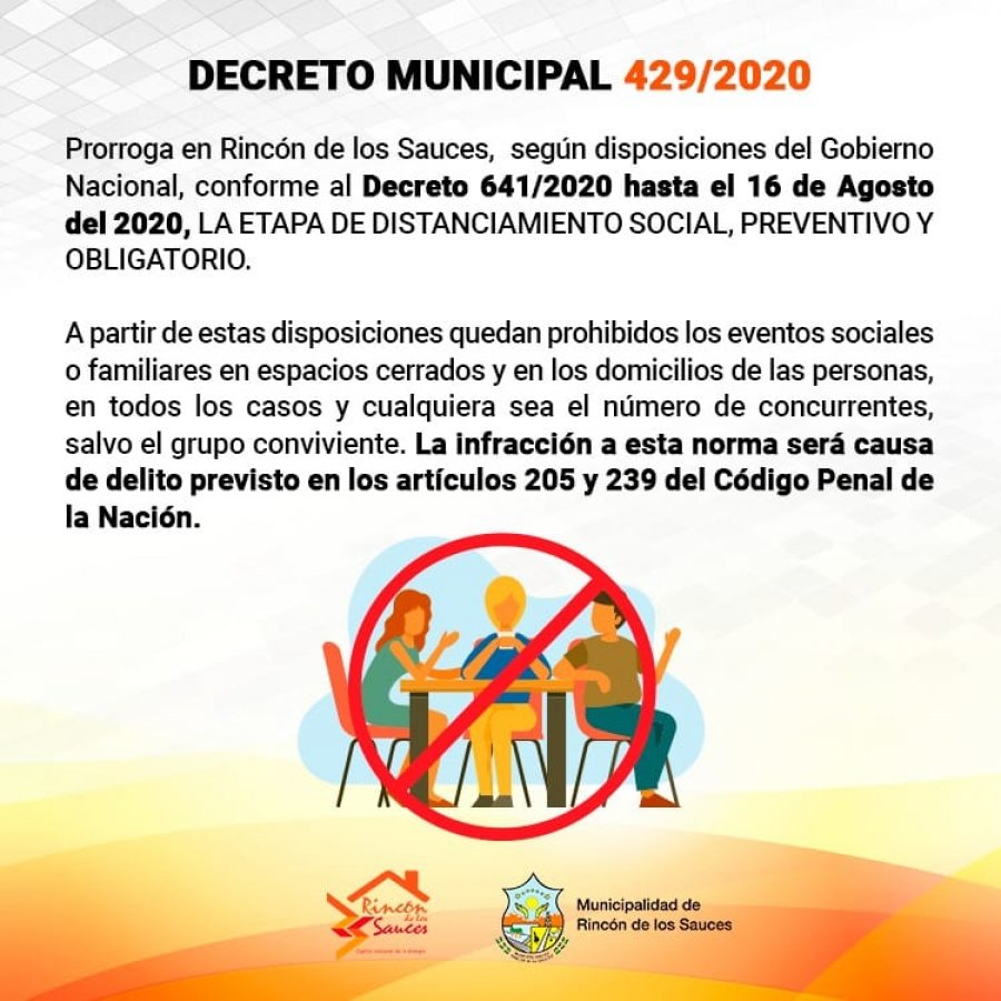 La municipalidad de Rincón de los Sauces informó que mediante el decreto municipal 429, adhirió al Decreto 641/2020 que prorroga hasta el el 16 de Agosto del 2020 la etapa de distanciamiento social, preventivo y obligatorio, en el marco de la emergencia por la pandemia del coronavirus.