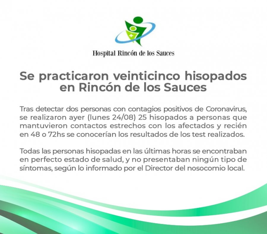Desde el Hospital de Rincón de los Sauces se informó que el lunes 24 de agosto se hisoparon a 25 personas, que habían sido contactos estrechos de las dos contagiadas por COVID-19.