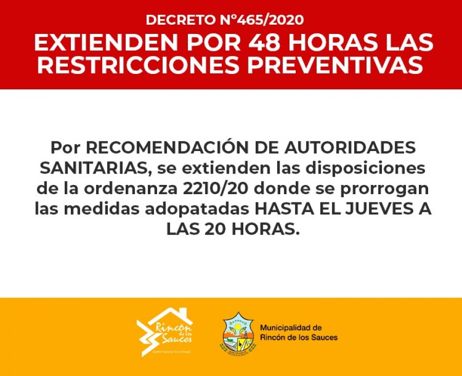 La municipalidad de Rincón de los Sauces informó que a través del Decreto Municipal 465/20, y por Recomendación de autoridades sanitarias, se extienden las disposiciones de la ordenanza 2210/20 donde se prorrogan las medidas adoptadas hasta el jueves a las 20 horas.