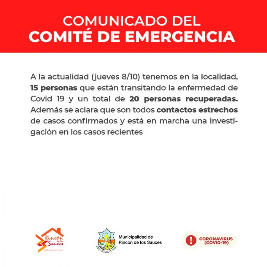 Desde el Comité de Emergencia de la municipalidad de Rincón de los Sauces, informaron a la comunidad que al jueves 8 de octubre hay 15 personas contagiadas por coronavirus (COVID-19) en la localidad.