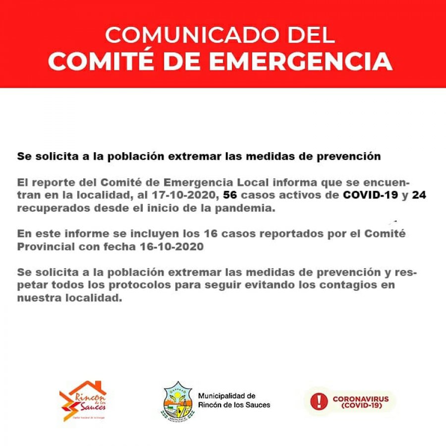 El Comité de Emergencia de Rincón de los Sauces informó que al sábado 17 de octubre hay en la ciudad 56 casos activos de coronavirus y 24 personas recuperadas desde el inicio de la pandemia.