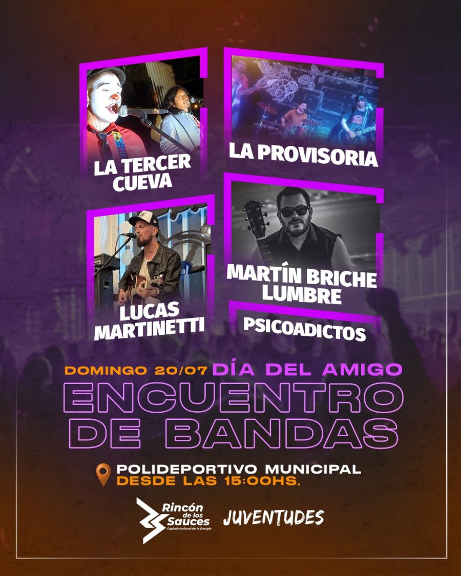 Este domingo 20 de julio, Rincón de los Sauces celebrará el Día del Amigo a puro rock y música en vivo con un Encuentro de Bandas que reunirá a artistas locales de distintos géneros en el Polideportivo Municipal. La actividad comenzará a las 15:00 horas y está organizada por el área de Juventudes de la Municipalidad.