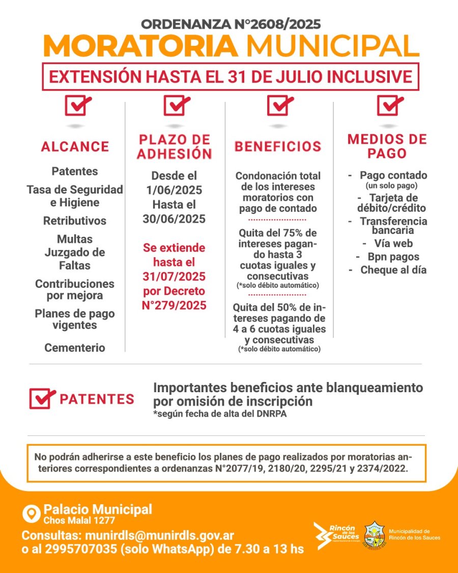 La Municipalidad de Rincón de los Sauces, informó que, mediante la Ordenanza N°2608/2025, extendió hasta el 31 de julio el plazo para adherirse a la moratoria que beneficia a contribuyentes con deudas en patentes, tasas, multas y otros conceptos. La medida, ampliada por el Decreto N°279/2025, busca facilitar la regularización de obligaciones con importantes descuentos.