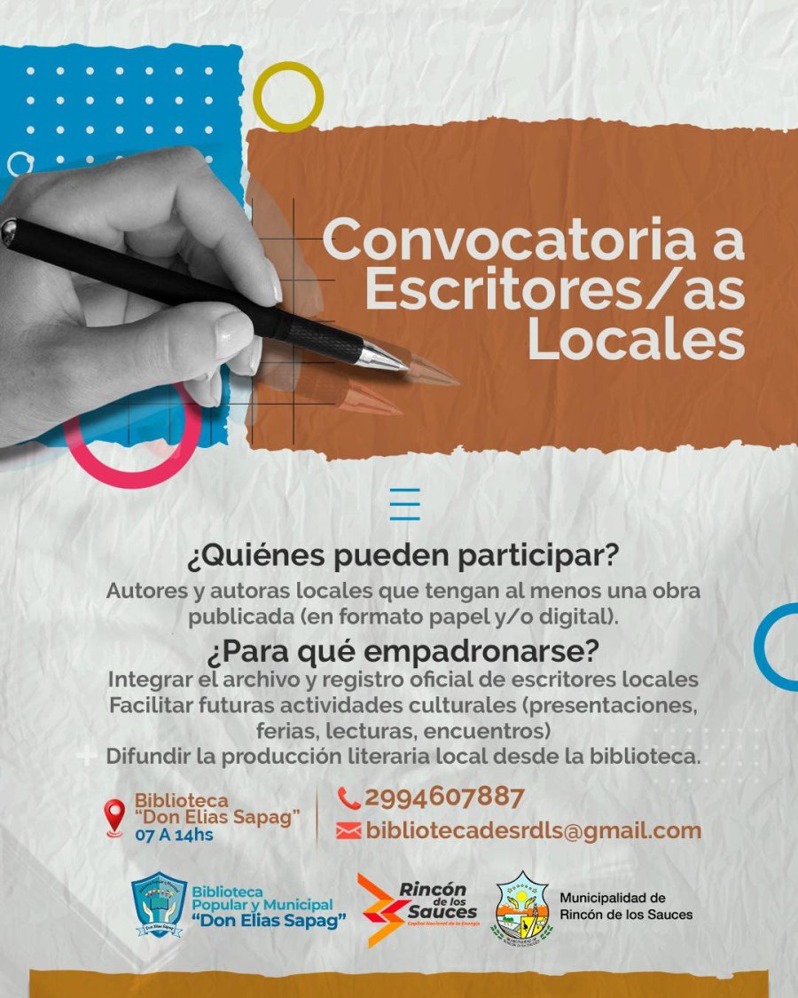 La Municipalidad de Rincón de los Sauces, a través de la Biblioteca Popular y Municipal “Don Elías Sapag”, lanzó una convocatoria destinada a escritores y escritoras locales con el objetivo de conformar un registro oficial de autores de la localidad.
