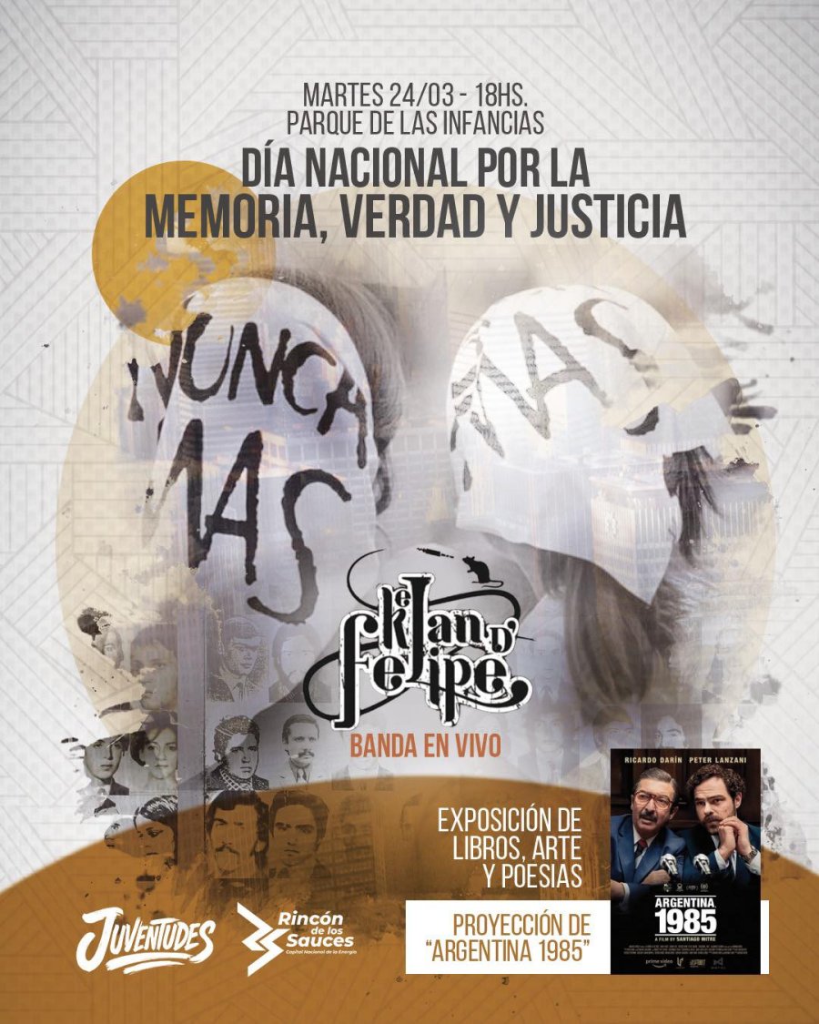 “Este 24 de marzo, en el Parque de las Infancias, te invitamos a ser parte de una jornada cargada de arte, cultura y compromiso: música en vivo, exposición de libros, arte y poesías, y la proyección de Argentina, 1985”.