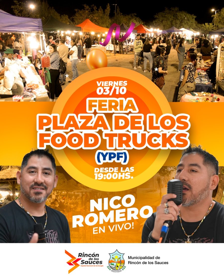 La Municipalidad de Rincón de los Sauces invita a la comunidad a participar de una nueva edición de la Feria Plaza de los Food Trucks, que tendrá lugar el viernes 3 y sábado 4 de octubre desde las 19 horas, en la plaza de YPF.