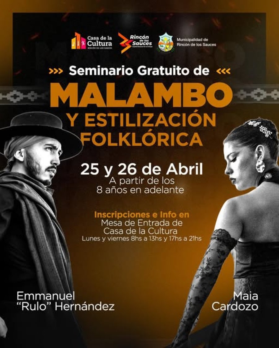 La Municipalidad de Rincón de los Sauces invita a participar del Seminario Gratuito de Malambo y Estilización Folclórica, una experiencia única para aprender de grandes referentes de la danza argentina.