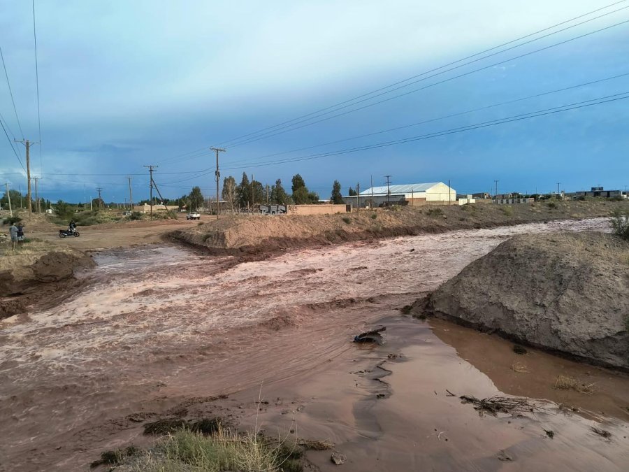 En otra de las imágenes difundidas en las últimas horas, se pudo observar la gran cantidad de agua que corría en el cañadón de ingreso a la ciudad.