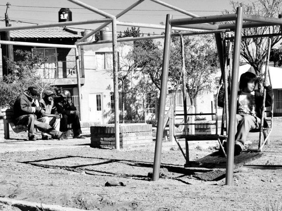 Nuevamente una foto dice más que mil palabras, y Adriana Canchi, fotógrafa de Rincón de los Sauces, comparte un instante en una plaza, donde se puede apreciar como en horas de la tarde un grupo de hombres toman vino en caja, a metros de un chico que intenta hamacarse.