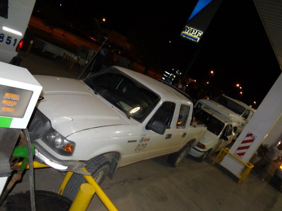 Una Ford Ranger patente FFM393 perteneciente a la empresa ESIM que en su puerta detallaba el móvil 029, quedó hundido su paragolpe trasero, y el delantero impactó con la protección de hierro de una estación de surtidores, los cuales por suerte no sufrieron daños.