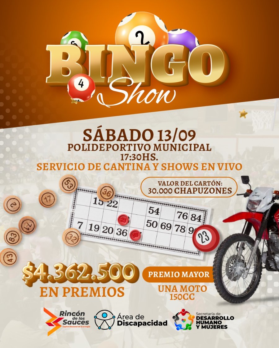 La Municipalidad de Rincón de los Sauces, a través del Área de Discapacidad y de la Secretaría de Desarrollo Humano y Mujeres, informó que el próximo sábado 13 de septiembre se realizará un bingo benéfico en el Polideportivo Municipal.